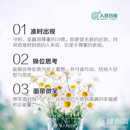 正文摘要:總是面帶微笑,你的身邊就充滿陽光和正能量;學(xué)會(huì)換位思考, 你的周圍就少了很多爭吵和誤解;懂得尊重他人,你也會(huì)受到別人的 尊重和理解;待人謙和有禮,你也會(huì)被這個(gè)世界溫柔以 ... |